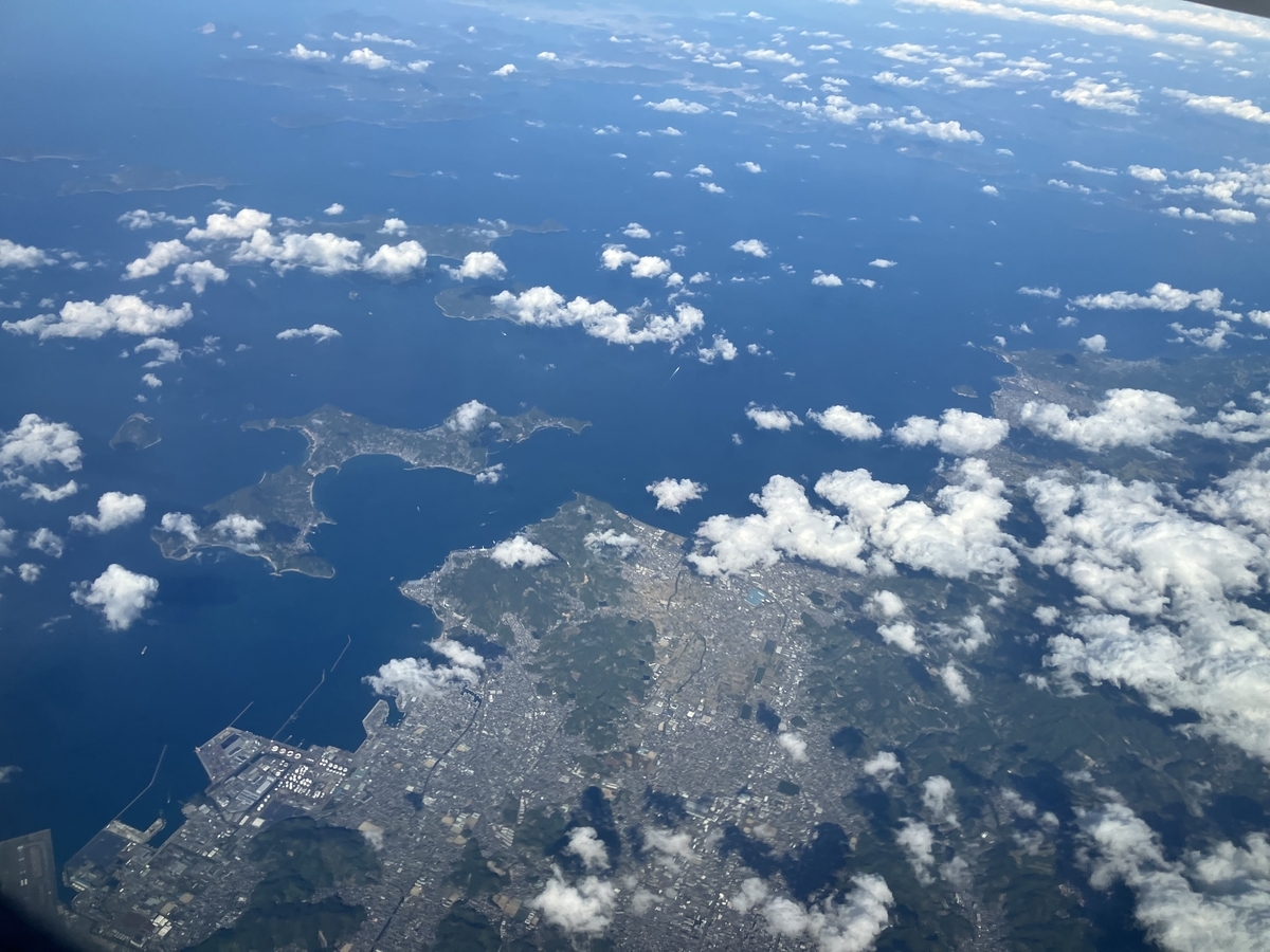 これは松山市上空。左下の滑走路は松山空港だよ。